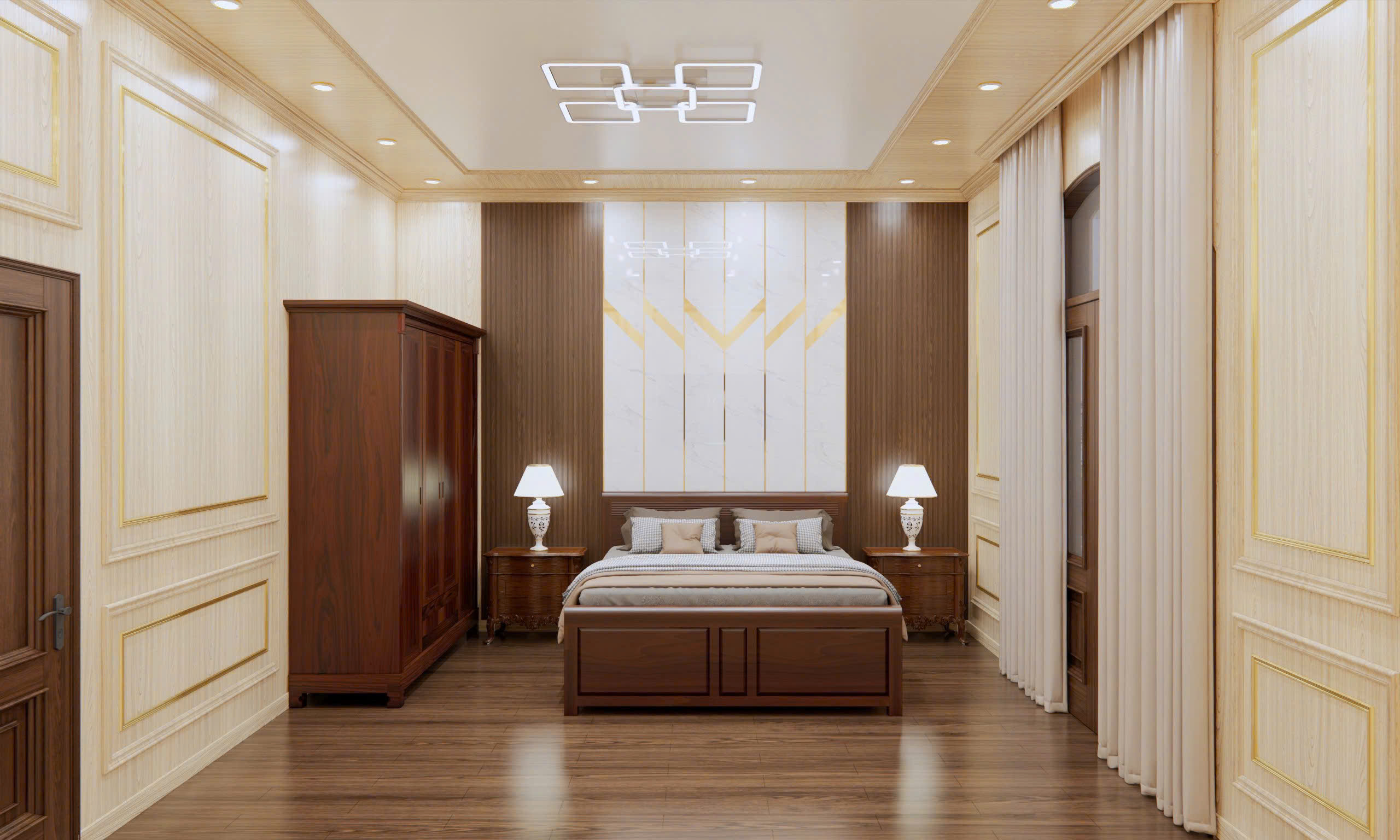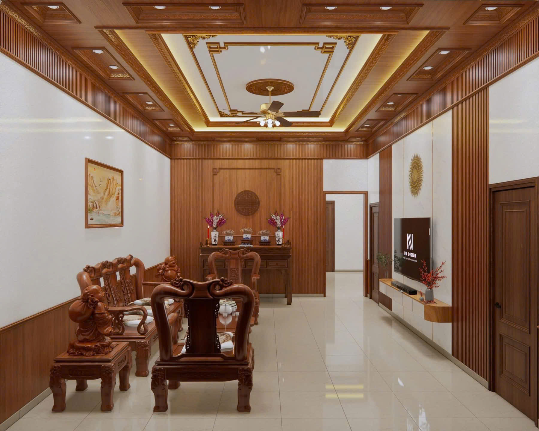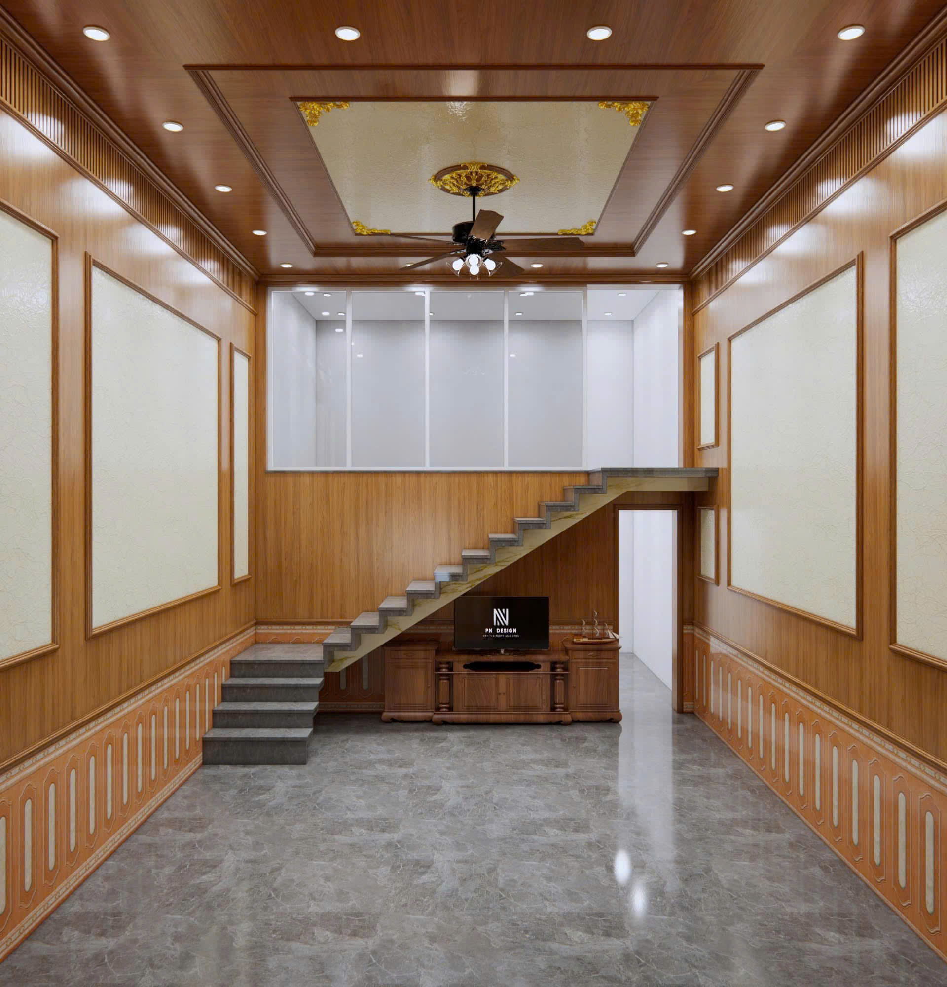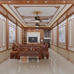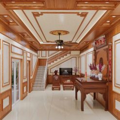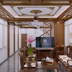 Khi kết hợp cùng phào chỉ PS dát vàng, trần vân gỗ trở nên đẳng cấp và mang hơi hướng tân cổ điển.