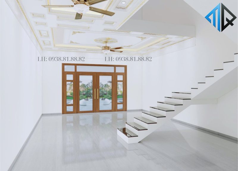 Công trình được thiết kế tinh tế với trần giật 2 cấp giả 3 cấp, giúp không gian trở nên cao, thoáng và nổi bật hơn hẳn so với kiểu trần phẳng truyền thống.