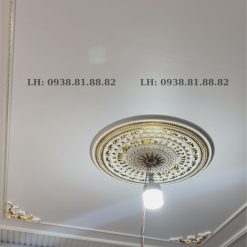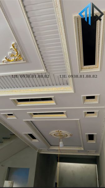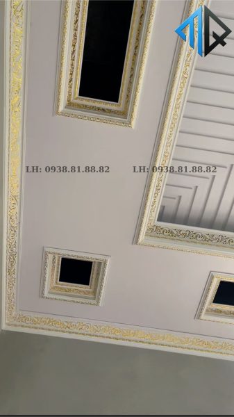 Phần phào chỉ PS hoa văn dát vàng được xử lý tỉ mỉ, chạy viền quanh trần, giúp không gian thêm sang trọng, đẳng cấp và tạo điểm nhấn tinh tế trong tổng thể.